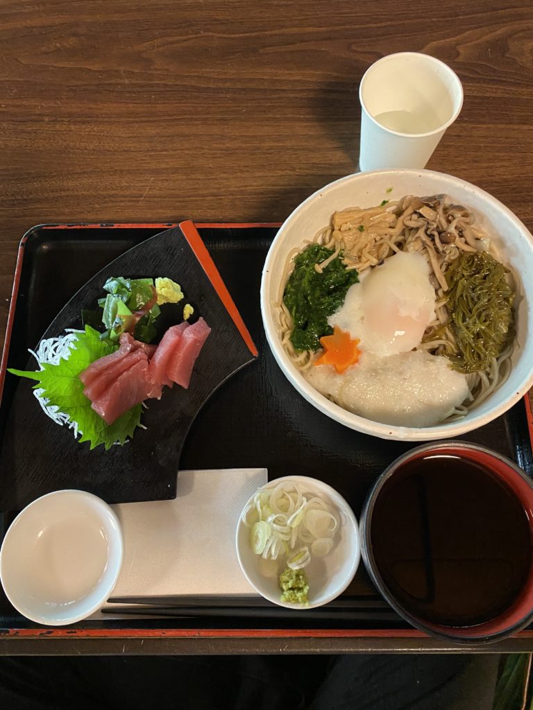 毎回、「栄養管理士さんの定食」を選んでいましたが、今回は介護も法要も終わったということで名物のお蕎麦+お刺身にしました。