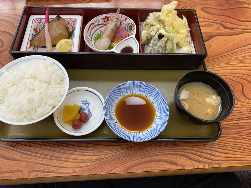 お風呂上がりに定食を。焼き魚が本当に美味しくて、なのに良心的な値段で、採算が取れているか心配になるほどでした。