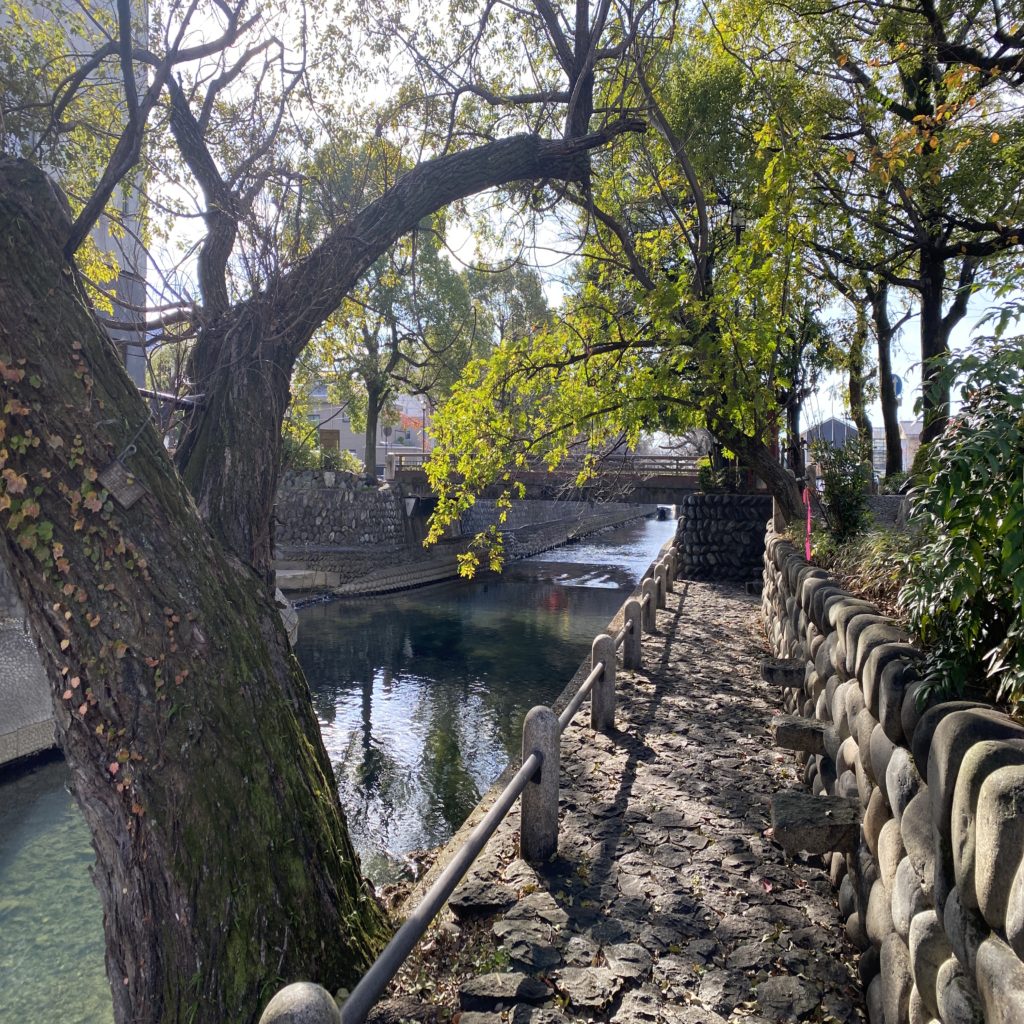 水門川と四季の広場↑。